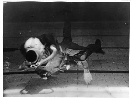 AN ADDITIONAL FEATURE for LCOCU personnel was a kapok-padded undersuit that provided some protection from underwater explosions. One of my friends, the late Lt Cdr Robbie Robinson MBE RN, owed his life to this garment. He had previously been involved in clearing obstacles from the beach approaches for the disastrous raid on Dieppe in August 1942. At Normandy he survived, although he was nearly “filleted” (his own word) when a German shell exploded in the water near him. A Royal Engineer Sapper, further from the explosion but lacking the protection of a kapok undersuit, was killed outright. LCOCU candidates were first sent to HMS Dolphin, the submarine base at Portsmouth. Here they were subjected to diver testing, including being compressed to 9m in a dry chamber and undergoing a simulated submarine escape in the 30m tank, before being trained to use the ubiquitous Davis Submerged Escape Apparatus (DSEA). The newly developed Siebe Gorman Amphibian Mk IV was trialled but the units finally settled on were the Dunlop Underwater Swimming Breathing Apparatus (UWSBA). All of these sets were oxygen rebreathers, but the Amphibian Mk IV was particularly popular because it was the first set to have a reducer. This provided a constant mass flow of oxygen at 1.1 litres per minute, whereas the other sets required the diver to crack open the bottle valve periodically to replace oxygen in the breathing bag as it was consumed. If the Amphibian-wearer needed extra oxygen for any reason, he could open a bypass valve to reinflate his counterlung immediately. This set had a single oxygen bottle mounted across the stomach and lead weights high on the back of the harness. A single hose led to the CO2 absorbent container tucked away inside the front of the apparatus. In the absence of a separate hose for expiration, this required deep “pendulum” breathing to ensure that the expired gas re-entered the counterlung after each breath. The UWSBA had two vertically mounted oxygen bottles on the front of the harness, separated by large flat lead weights across the stomach. Its counterlung or breathing bag was mounted across the chest as with the DSEA but, like the Amphibian Mk IV, it had lobes extending level with the ears. Carbon dioxide absorbent was contained in a large cylinder across the back of the shoulders. A circular full-face mask was fitted with a mouthpiece and spit cock connected by twin corrugated rubber hoses, one of which led to the counterlung on the right shoulder for inhalation while the other led over the left shoulder to the CO2 absorbent container for exhalation.